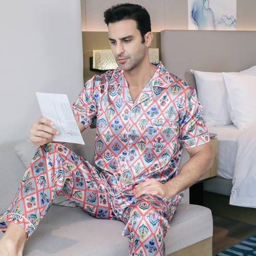Fabric type: 97% Polyester, 3% SpandexCare instructions: Machine WashOrigin: Imported★【Materials】97% Polyester, 3% Spandex. This lightweight pajama set is made of lightweigh silky satin, soft,breathable and skin-friendly,which makes you comfy to wear all day.and help you have a sound sleep.★【Features】Button closure. Relaxed fit two-piece cozy pajama sleepwear pajama pants set features silky long pants with elastic waistband and matching silky short sleeve lapel top with chest pocket. The pajamas are multi-colored and patterned with different styles of flowers.★【Occasion】Men's sleepwear are perfect for spring,autumn and summer.Suitable for Christmas,Halloween,birthday party,pajama party,lounging★【Size Tips】Model Size:L,Height-5'10,Weight-172lb,Bust-40.9, Waist-32.3, Hips-38.29.Model size is for reference only,more measurements please refer to the size chart on description before ordering.★【Washing Tips】Machine Washable, Hand Washed Suggestion. with cold water, no ironed at high temperature, no bleachedStatic electricity treatment plan 1: Maintaining indoor humidity helps to avoid static electricity issues in pajamas. Using a humidifier or placing a water basin indoors to increase air humidity can help reduce the generation of static electricity. Solution 2: Hang it on a hanger and gently tap it to help release the charge. Solution 3: Spray pajamas with antistatic spray, which can also effectively reduce the problem of static electricity. Perfect for everyday use. High quality materials and excellent craftsmanship ensure long-lasting durability.