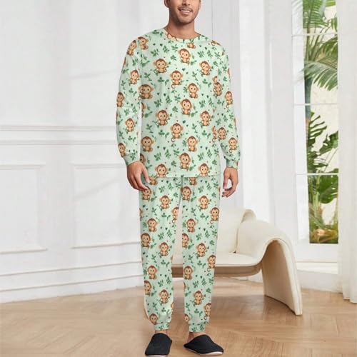 Cute Cartoon Monkey Men’s Pajama Set Long Sleeve Top And Pants Loungewear Sleepwear Pjs Nightwear