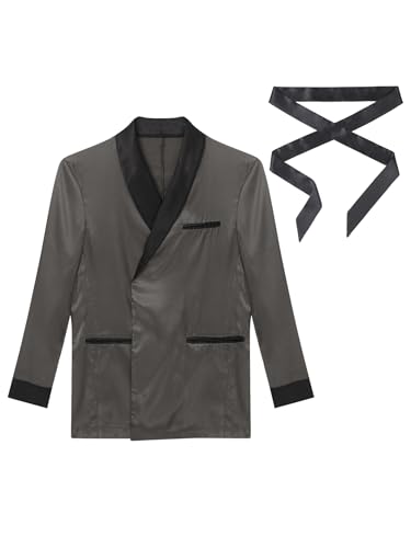 Linjinx Men's Satin Smoking Jacket Robe Lapel Long Sleeve Kimono Bathrobe with Belt Nightwear 6