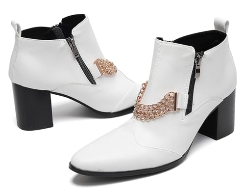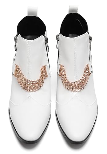 Sole material: RubberOuter material: LeatherClosure type: ZipWater resistance level: Not Water ResistantPremium Materials: Men's dress shoes are made of high quality cowhide leather with soft upper and sturdy rubber soles, durable and comfortable, breathable and luxurious look.High-Quality Craft:These mens casual party western boots are exquisite craftsmanship, pure hand sewing, smooth lines, seiko fine work, set off your noble and elegant temperament.Occasion: Mens ankle chelse boots are perfect for all kinds of your important event. Wedding, party, birthday, carnival, graduation, stage, travel, dance, prom, etc. Make them a show stopper with a WOW factor!Easy Zip Closure : Inner side zipper ensures easy slip-on access while maintaining a clean outer design—no laces, no hassle.Style:Bold Chain Design – Eye-catching metallic chain across the upper brings a modern punk vibe to classic ankle boots—perfect for standing out. Perfect for everyday use. High quality materials and excellent craftsmanship ensure long-lasting durability.