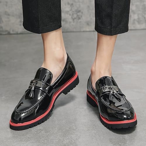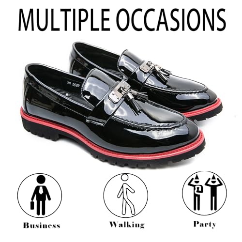 Men's Patent Leather Chain Decor Loafers Lug Sole Non-Slip Platform Tassel Dress Shoes Comfort Pointed Toe Slip-on Block Heel Oxfords for Business Driving Office Walking 6